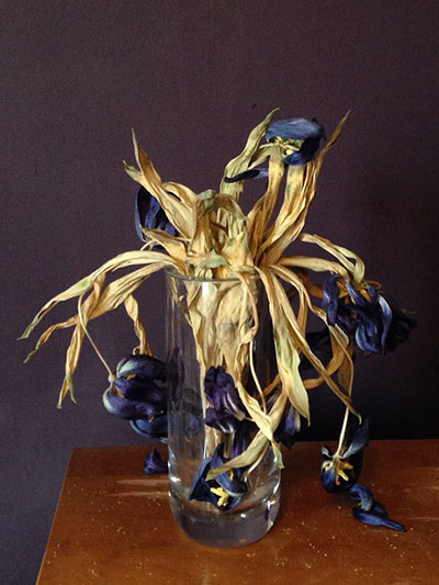 I started playing in my sketchbooks, exploring all the different ways to make purples and all the variations. I made colours that reminded me of lilacs, lavender, hyacinths, bruises, irises, sunsets, smoke, the heart of a flame, tulips (dead or alive!), Elizabeth Taylor’s eyes, that pantsuit I had in the 70s, royal robes, and emperor’s togas. I covered the waterfront. Dark purples, palest tints, more red, more blue, and on to murky browns and greys with just a whiff of violet.